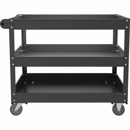 Utility cart features a three-shelf design to offer a convenient worksurface and spacious storage for your supplies. All shelves are surrounded with a raised lip (3-1/4″ high) to keep your contents secure during transit. Industrial-strength casters allow you to maneuver with ease so you can transport your items from room to room. Durable steel construction supports up to 400 lb.