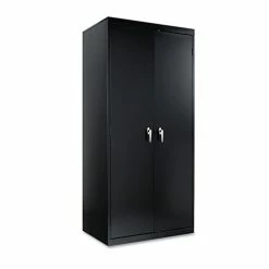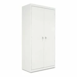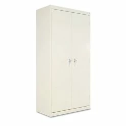 Built-in shelf support tabs—no more lost clips! Heavy-duty construction ensures extreme durability. Shelves adjust to accommodate different sized items. Keep contents secured with lock. 150 lb. weight capacity per shelf. Color: Light Gray; Overall Width: 36″; Overall Depth: 18″; Overall Height: 72″.