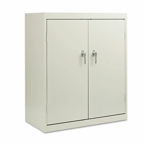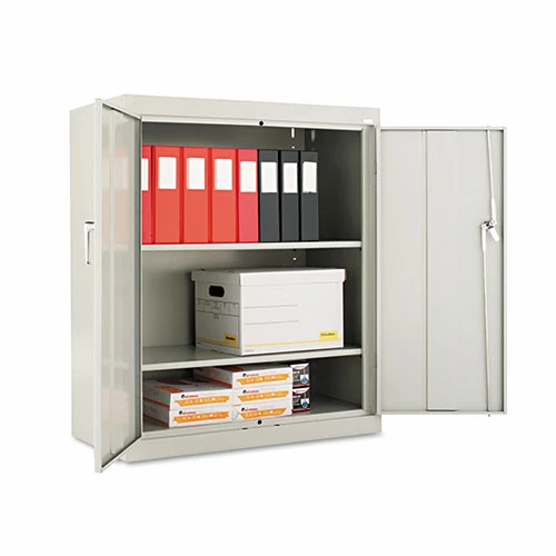 Assembled storage cabinet with three-point locking bar system locks top, bottom and doors. Doors open 180° for easy access to contents. Cabinet made of industrial grade steel with satin chrome double handles.
