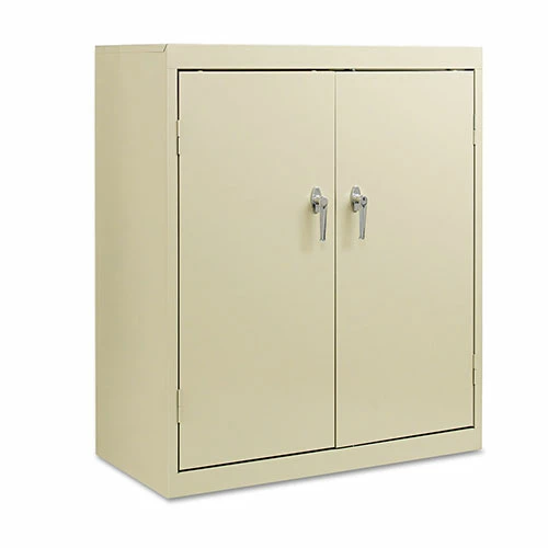 Assembled storage cabinet with three-point locking bar system locks top, bottom and doors. Doors open 180° for easy access to contents. Cabinet made of industrial grade steel with satin chrome double handles.
