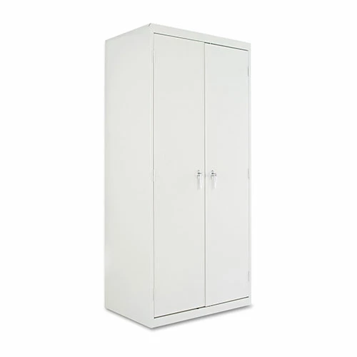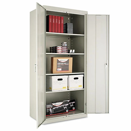 Assembled storage cabinet with three-point locking bar system locks top, bottom and doors. Doors open 180° for easy access to contents. Cabinet made of industrial grade steel with satin chrome double handles.
