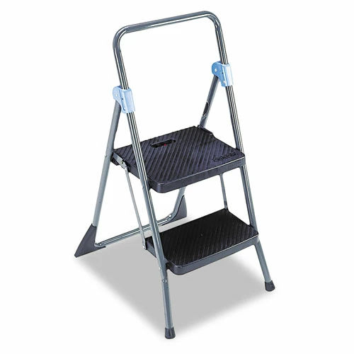Large 14 1/2w x 12 1/4d top platform step; steps have nonskid treads. Folds for easy storage. Durable, tubular steel frame forms handrail and knee brace. WARNING: Metal ladders conduct electricity. Do not use where contact may be made with live electrical circuits.