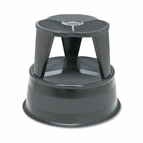 Spring-mounted casters retract when stool is stepped on. Steel construction with nonslip vinyl treads and protective bumper around base. Ships in two pieces and requires no tools for assembly.