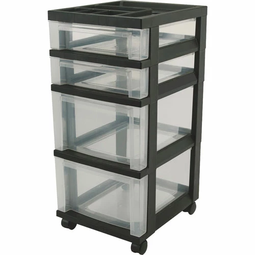 Mini Chest offers a modular, durable design perfect for everyday storage in the office or home. Organizer tray on top allows easy access. Removable casters provide easy mobility. Clear plastic trays give you a clear view of the contents.