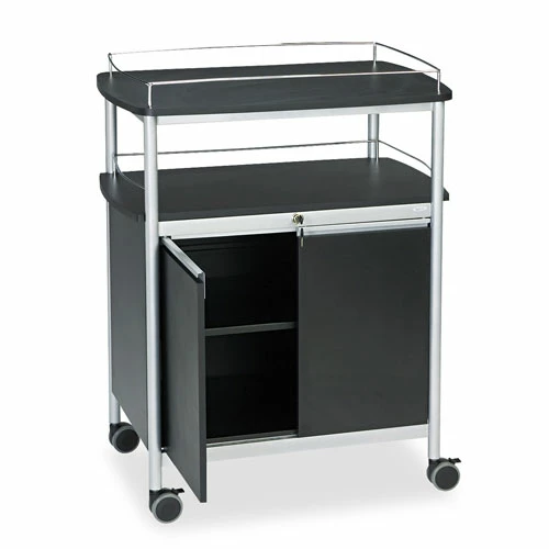 Suitable for lobbies, meeting spaces, breakrooms and conference rooms. Melamine top features 1 1/2″ high wire rails to help prevent accidental spills. Locking cabinet features one adjustable, 29″w x 16 1/2″d steel shelf. 8 3/4″ high open storage area. Mobile on 3 1/2″ casters (two locking).