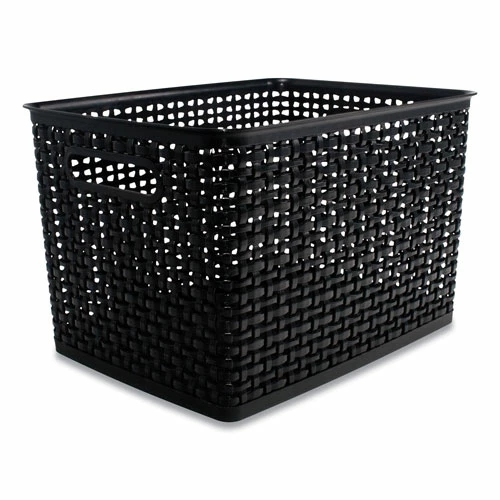 Perfect for storing a variety of office or household supplies. This sturdy plastic bin is easy to clean, features two handles for easy transportation and has a stylish design.