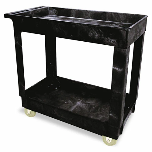 Quiet, lightweight and easy to maneuver cart. Two large trays hold items to be transported. 300 lb. capacity. Molded-in handle with handy storage compartments. 5″ non-marking swivel casters.