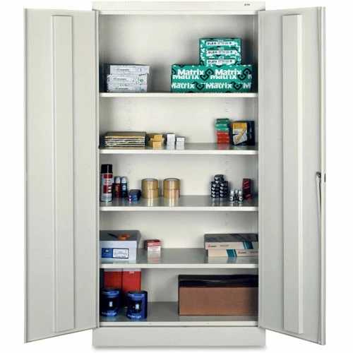 72″ high Standard Storage Cabinet with 18″ deep shelves are the perfect choice for office or industrial applications. Shelves adjust in 2″ increments for flexibility. Up to three-leaf hinges maintain door alignment in larger cabinets. Reinforced doors lock at three points for maximum security. Raised base keeps cabinet contents from contacting floor moisture. Attractive chrome handle locks both doors.