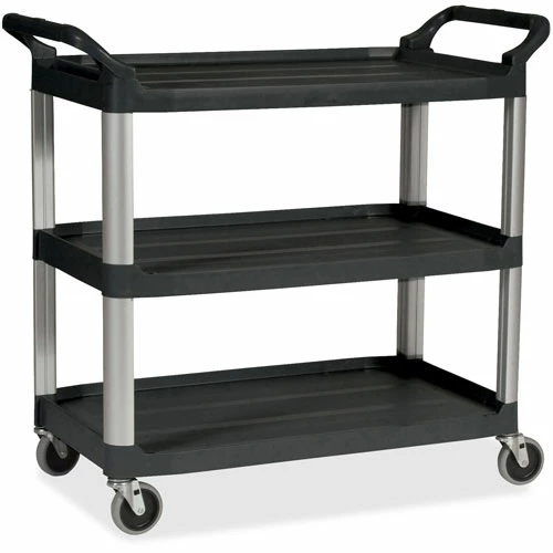 Versatile; for audio/video, filing, food service. 200-lb. capacity. Shelves feature 1/4″ lip on three sides and one flat side for easy loading. Compatible with Optional Refuse/Utility Bins (RUB335388BLA/RUB335488BLA), sold separately. Brushed aluminum uprights, dual molded handles. 4″ nonmarking swivel casters. 18-5/8w x 33-5/8d x 37-3/4h. Assembly required.