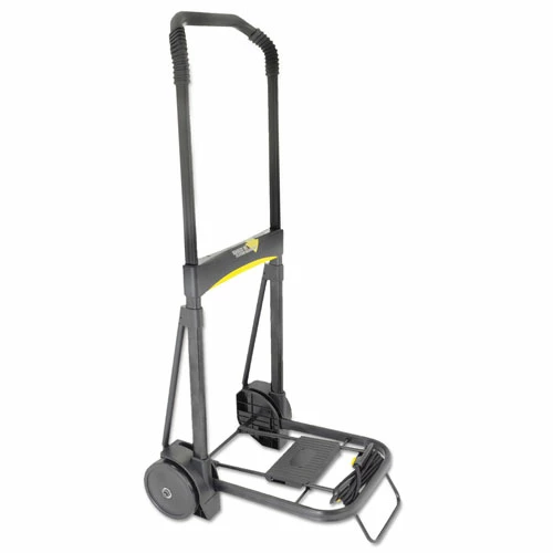 Locking telescopic handle extends to 39″. Ball bearing rubber wheels absorb impact and roll smoothly. Strong steel and aluminum reinforced tubular structure. Bungee cord with locking clasp. Collapses with simple push button release mechanism.