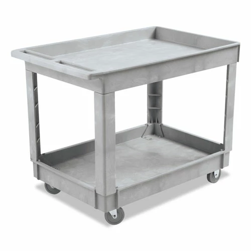 Durable resin construction helps create a strong, two-shelf utility cart. Molded-in handle allows for easy steering on the go. Convenient swivel casters allow multi-directional travel. Fixed shelves with a raised lip provide a sturdy storage spot.